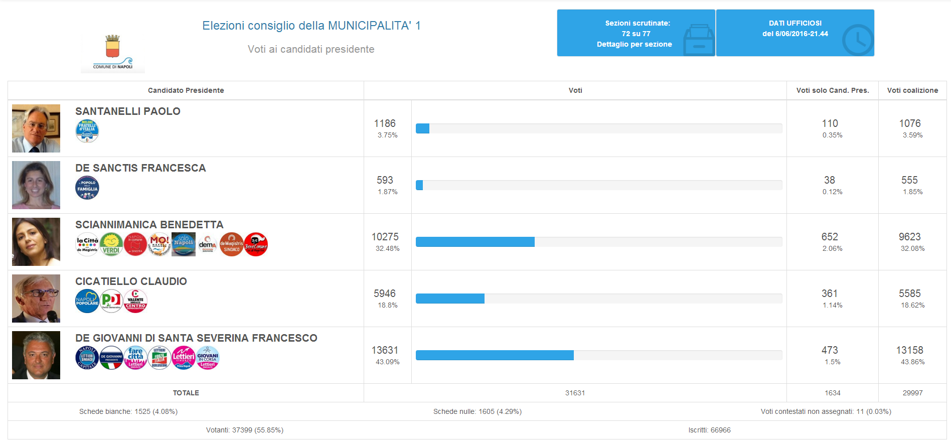 NB Nella notte tra domenica e lunedì ci sono stati molti problemi nel conteggio delle schede, soprattutto nello spoglio del Comune. Cosa che ha rallentato lo spoglio delle Municipalità e attualmente mancano ancora due sezioni e rendono i dati ufficiosi. Voci di corridoio, inoltre, ci parlano anche di alcuni ricorsi che partiranno nei confronti di alcune sezioni, tra cui due del Liceo Umberto e Mercalli.