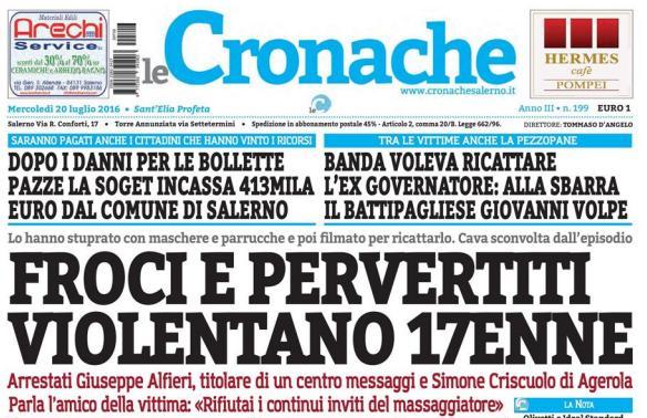 “Froci e pervertiti violentano 17enne“. Questo il titolo della prima pagina de Le Cronache di Salerno che ha scatenato una feroce polemica. Il giornale si riferisce ad un episodio drammatico: lo stupro da parte di 4 uomini nei confronti di un 17enne, a Cava dei Tirreni, nel salernitano.