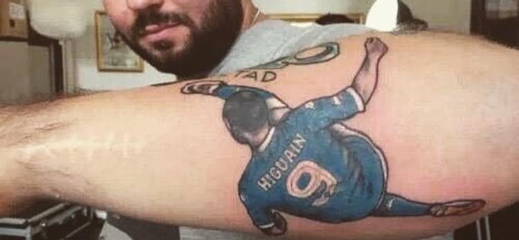 Ma l’immagine che probabilmente è diventata più virale è quella del tifoso che si era fatto tatuare sull’avambraccio il Pipita. La foto del disegno ha avuto migliaia di condivisioni sui principali social network e suscitato tanta ironia. Il tatuaggio ha immortalato il momento in cui Higuain, con una spettacolare rovesciata, ha realizzato lo scorso 14 maggio il 36esimo gol in campionato, record dei record per la Serie A.