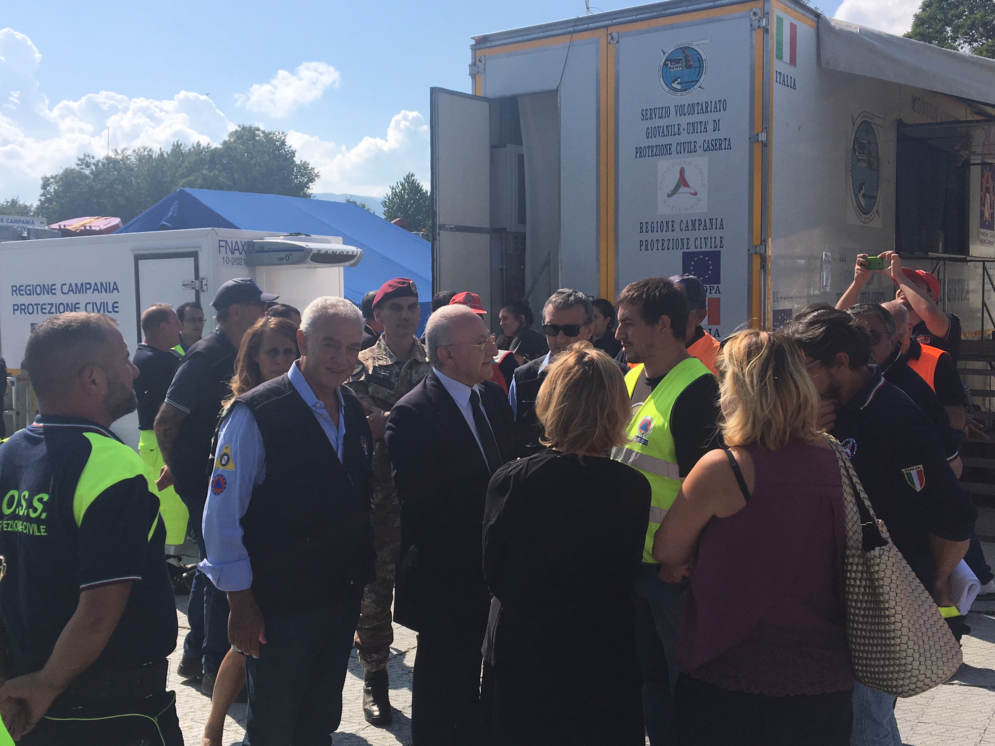 Al termine della Conferenza, il Presidente De Luca si è recato in visita al campo di accoglienza realizzato dalla Protezione Civile della Regione Campania nel Comune di Arquata del Tronto (in provincia di Ascoli Piceno). Il campo accoglie attualmente 150 persone, tra cui venti bambini, e mette a disposizione delle comunità 250 pasti al giorno. “Abbiamo voluto esprimere in maniera diretta la nostra solidarietà alle famiglie di Arquata e di tutti i Comuni colpiti in maniera così drammatica dal sisma. Ai volontari e agli operatori della Protezione Civile va il nostro ringraziamento per lo straordinario lavoro che stanno svolgendo.