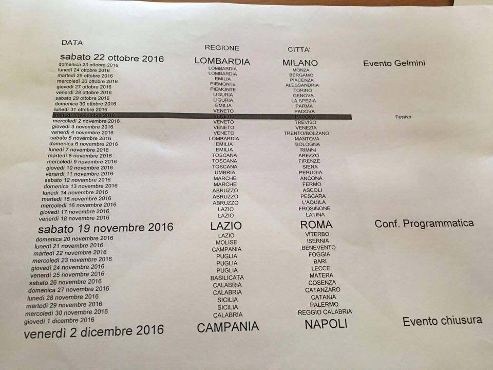 Il tour di Forza Italia partirà ufficialmente sabato 22 ottobre 2016 (venerdì 21 a Roma si terrà la conferenza stampa di presentazione dell’evento) da Milano con l’ex ministro Maria Stella Gelmini. Sabato 19 novembre 2016 a Roma, si terrà la conferenza programmatica sul No alla riforma prima del gran finale a Napoli, 2 dicembre 2016, 48 ore prima del voto, con Berlusconi e tutti i big del centrodestra.