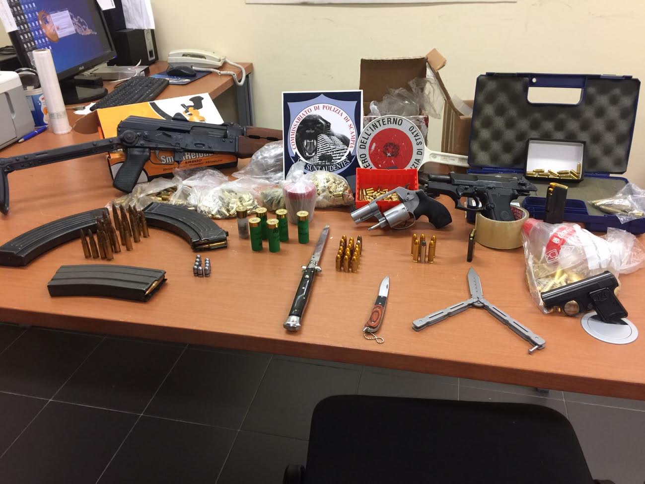 In casa di Antonio Amato è stata sequestrata dagli agenti del Commissariato Scampia una “Smith & Wesson” modello 357 risultata rubata due anni fa, un caricatore di kalashnikov,e decine di proiettili di vario calibro. Nell’abitazione del figlio sono stati sequestrati un mitra kalashnikov M92 con due caricatori contenenti 30 cartucce ciascuno, un centinaio di cartucce calibro 7.62 e calibro 357 magnum, una pistola 6.35 con 17 cartucce, ed una “Stoeger Cougar” 8000 L, calibro 9×21, con 13 cartucce, oltre a tre coltelli.