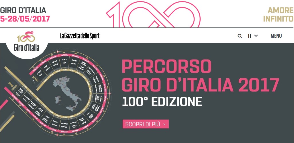 La Gazzetta dello Sport ha presentato in pompa magna la 100esima edizione del Giro d’Italia. La celebre corsa rosa partirà da Alghero in Sardegna il 5 maggio 2017, mentre l’arrivo è previsto per il 28 dello stesso mese a Milano. In totale i ciclisti percorreranno oltre 3mila chilometri in 21 tappe. Di queste 6 sono per velocisti, 8 di media difficoltà, 5 di alta difficoltà e 2 a cronometro. La Cima Coppi è prevista sullo Stelvio mentre la tappa più lunga sarà la Forlì – Reggio Emilia di 237 chilometri.