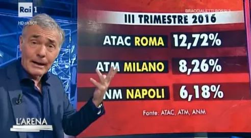 Strano che il conduttore della Rai abbia cambiato rotta di pensiero sui napoletani, forse i troppi attacchi ricevuti nell’ultimo periodo gli hanno fatto comprendere di aver fatto qualche errore di troppo, addirittura il Movimento Neoborbonico aveva inviato una petizione alla Camera e una richiesta di intervento alla Commissione Vigilanza della Rai. Qualunque sia il motivo la scorsa domenica Giletti ha mostrato il trimestre 2016 sull’assenteismo dei trasporti pubblici e l’Anm di Napoli si trovava al terzo posto con il 6,18%. Al primo posto Roma (ATAC) con il 12,72% e al secondo posto Milano (ATM) con l’8,26%.