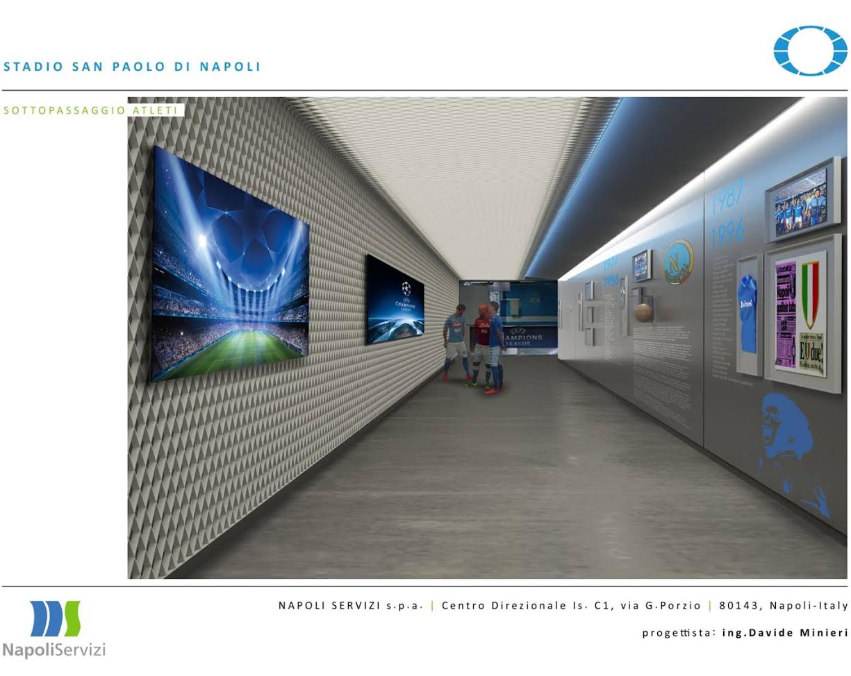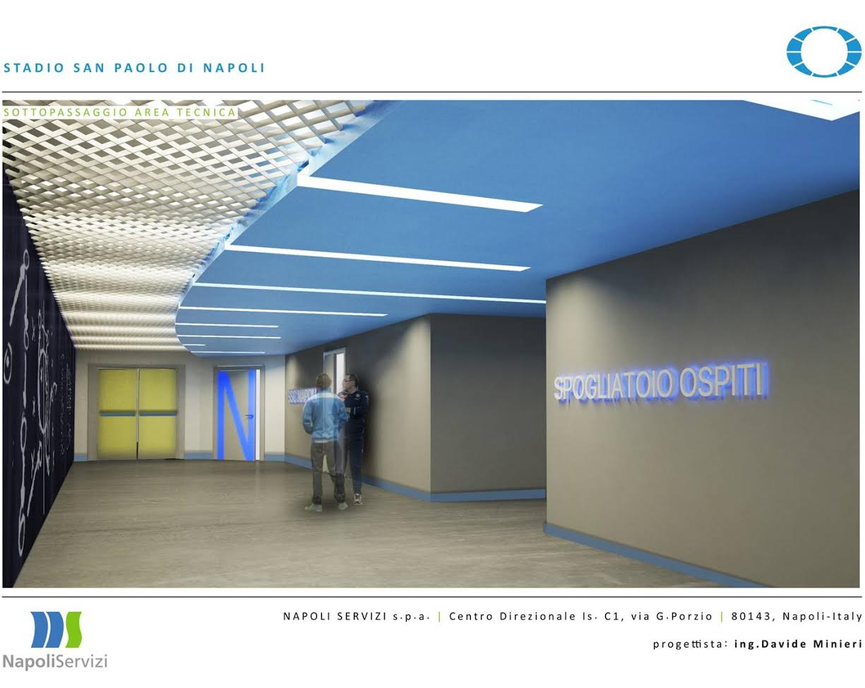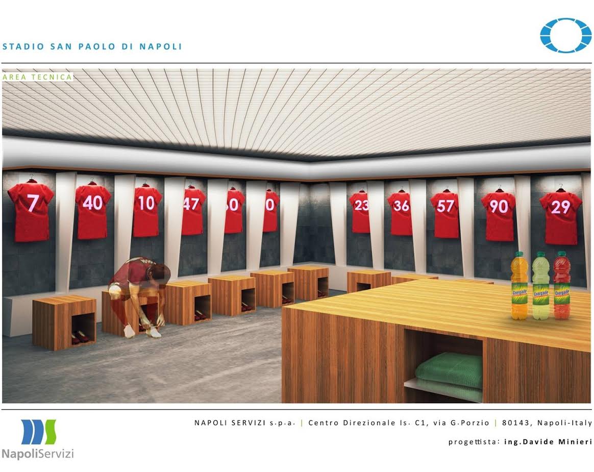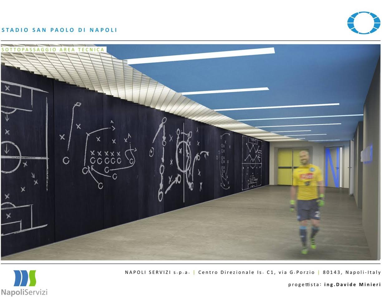Si ristrutturerà l’intera area degli spogliatoi che prevederà sia un’area tecnica, con tanto di lavagne lungo il corridoio, che una galleria storica del club, una sorta di museo dove verranno raffigurati i momenti più importanti della storia del Napoli.