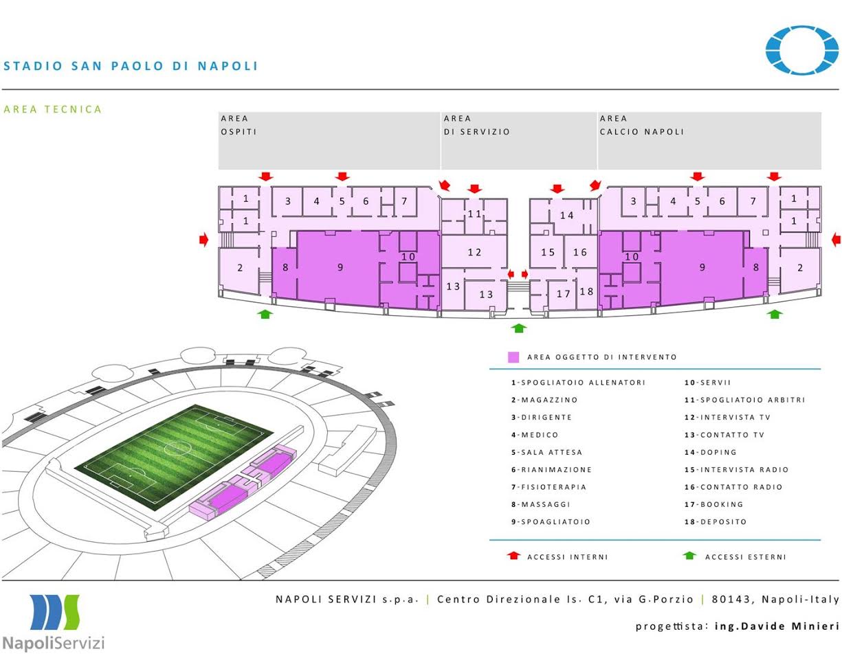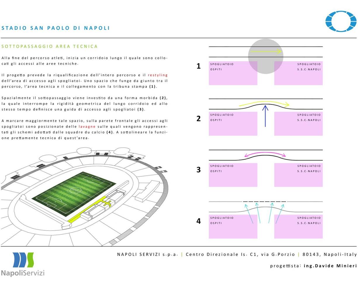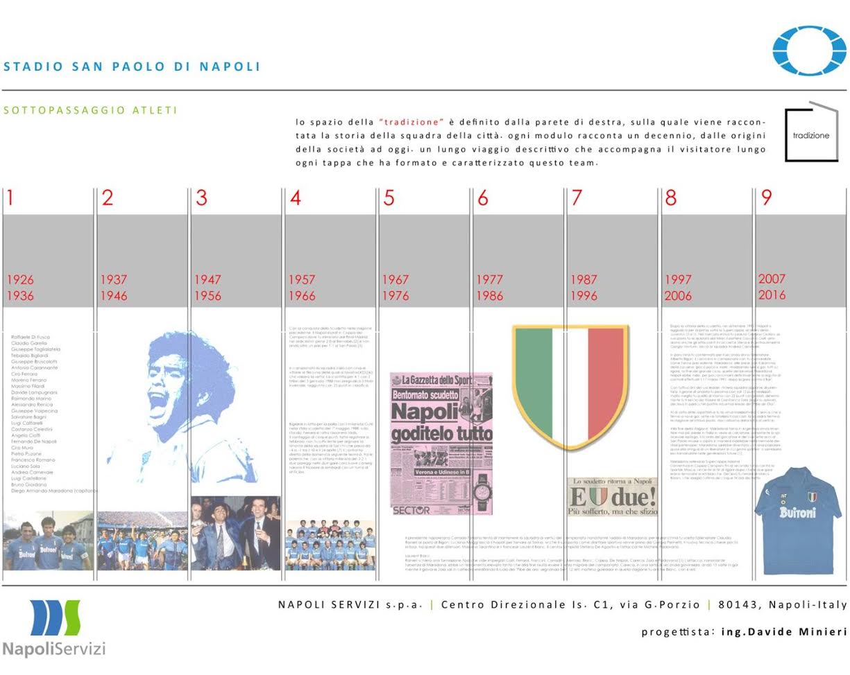 Si ristrutturerà l’intera area degli spogliatoi che prevederà sia un’area tecnica, con tanto di lavagne lungo il corridoio, che una galleria storica del club, una sorta di museo dove verranno raffigurati i momenti più importanti della storia del Napoli.