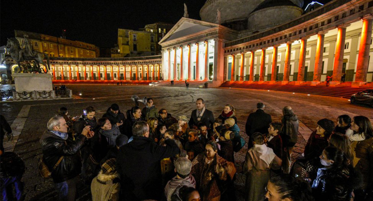 L’occasione per queste simboliche dichiarazioni è stata l’accensione del porticato della chiesa che domina la splendida Piazza del Plebiscito, cuore pulsante di Napoli, che con questo gesto manda un segnale di pace e unione in quei posti del mondo vittime di guerra e distruzione.