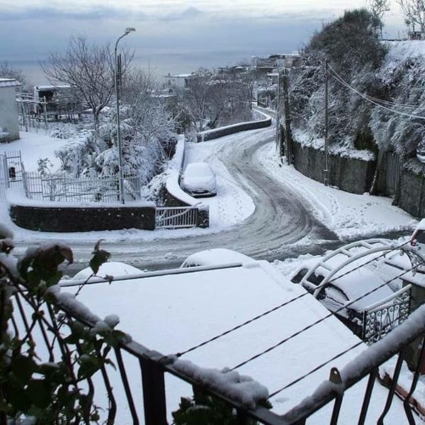 L’ondata di freddo e gelo che ha colpito la Campania non ha risparmiato neanche le zone costiere e le isole. La penisola sorrentina, la costiera amalfitana, Ischia e Capri sono innevate. Gli abitanti del posto si sono risvegliati ed hanno assistito ad una nevicata che ha imbiancato tutto.