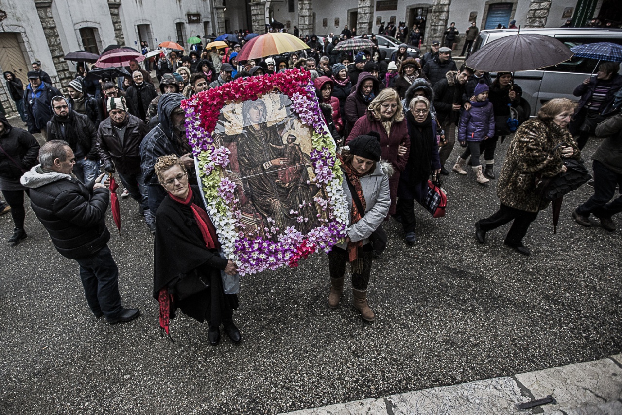 La storia però andò diversamente. Quando la Madonna posò, infatti, il suo sguardo sui due innamorati, fu talmente commossa dal loro amore che decise di accorrere il loro soccorso. Fu così che la Vergine Schiavona liberò entrambi colpendo con dei raggi di sole la lastra di ghiaccio che li teneva entrambi prigionieri. Da allora gay, lesbiche e transessuali rendono omaggio alla Vergine insieme a tanti altri pellegrini cantando e danzando per ore al suono delle tammorre.