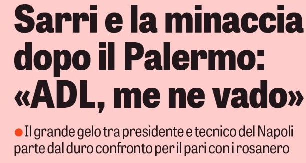 La Gazzetta (con un pizzico di ritardo ma con un tempismo ad hoc considerato il clima teso in casa azzurra) racconta il concitato post partita e di “un De Laurentiis furioso dopo il pareggio interno col Palermo, di urla e insulti nei confronti di Maurizio Sarri, reo di aver sbagliato la formazione. Un delirio, che avrebbe spinto l’allenatore a minacciare le dimissioni: «Me ne vado», avrebbe detto. E lo stesso avrebbe fatto Cristiano Giuntoli, se la questione non fosse rientrata. Al direttore sportivo, fin qui, non è mai stato consentito di esprimere, pubblicamente, un parere e, per giunta, mai presentato ufficialmente”.