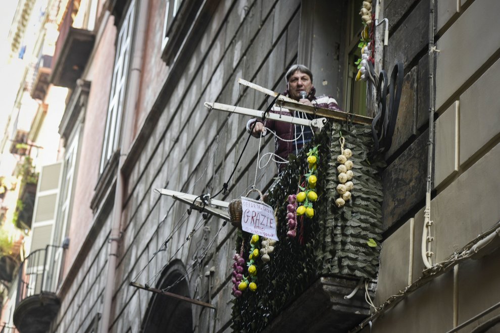 Tra la folla dei Decumani a Napoli si sente una voce, è quella di “Topolino” nome d’arte di Antonio Borrelli, sessantenne agli arresti domiciliari che nel fine settimana intona canzoni dal suo balcone per i passanti e i turisti che invadono le vie del centro.