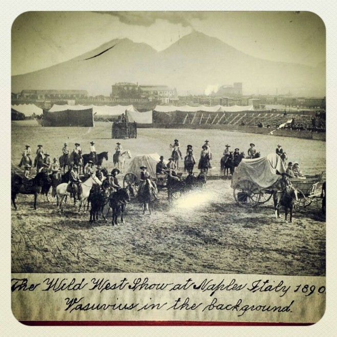 Il Corriere di Napoli in data 30-31 gennaio 1890 così annunciava ai partenopei l’arrivo di William Frederick Cody, in arte Buffalo Bill, nel capoluogo campano «La compagnia americana Buffalo Bill’s Wild West ha cominciato un corso di rappresentazioni al Corso Meridionale al Rione Vasto alla Ferrovia da lunedì 27 Gennaio alle ore 2,30 pom. La suddetta Compagnia si compone di 100 Indiani, 100 tiratori, cacciatori, cowboys e cavallerizzi. 200 animali; bufali selvaggi, cavalli, muli, ecc. comandati dal Col. W.F. Cody “Buffalo Bill”». Nonostante l’annuncio informasse la cittadinanza dell’arrivo dell’eroe del Vecchio West all’ombra del Vesuvio furono in pochi a crederci davvero.