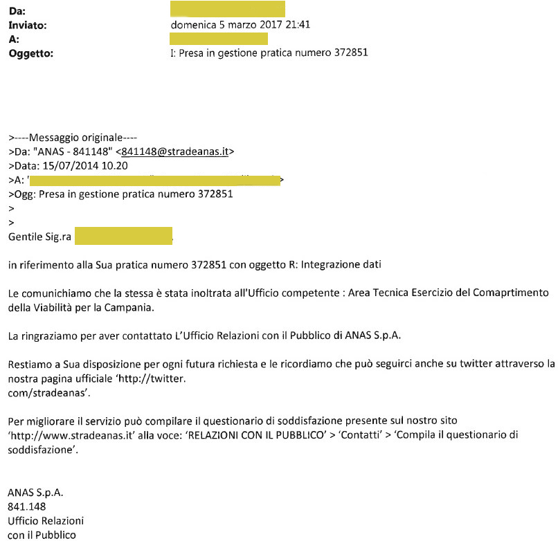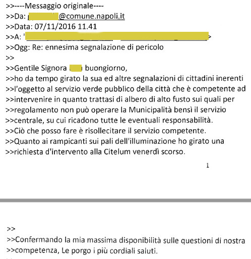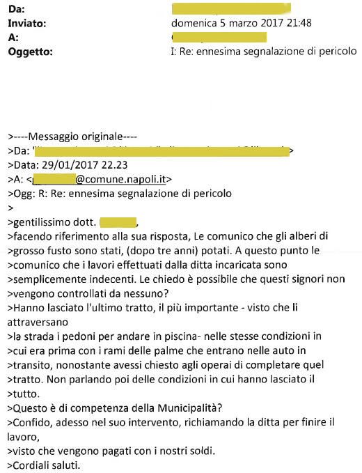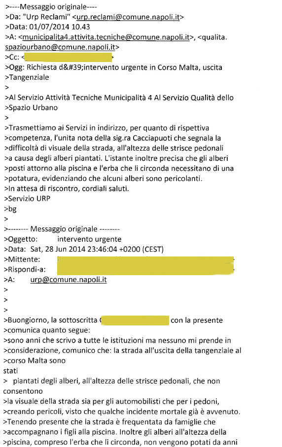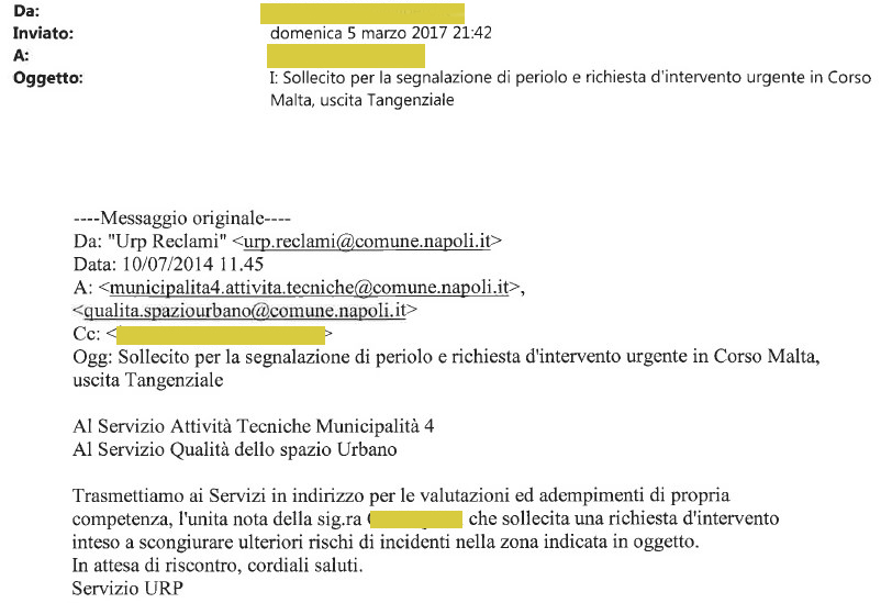 Inoltre a disposizione di Vocedinapoli.it, tutte le mail che L.C. ha inviato al comune, all’assessorato predisposto, all’Urp, alla municipalità di competenza, all’Anas “È stato un continuo rimbalzo da un ufficio all’altro sempre se ero fortunata di ricevere una risposta“. È dal 2013 che la nostra lettrice segnala alle autorità e le istituzioni la situazione di pericolo che caratterizza questo tratto stradale: “Quando si esce dalla tangenziale al corso Malta e si scende in direzione del Centro Direzionale, oltre a punto già discusso dove si attraversa per raggiungere la piscina, ci sono diversi alberi e piante che andrebbero potati per favorire la visuale sia degli automobilisti che dei pedoni“.