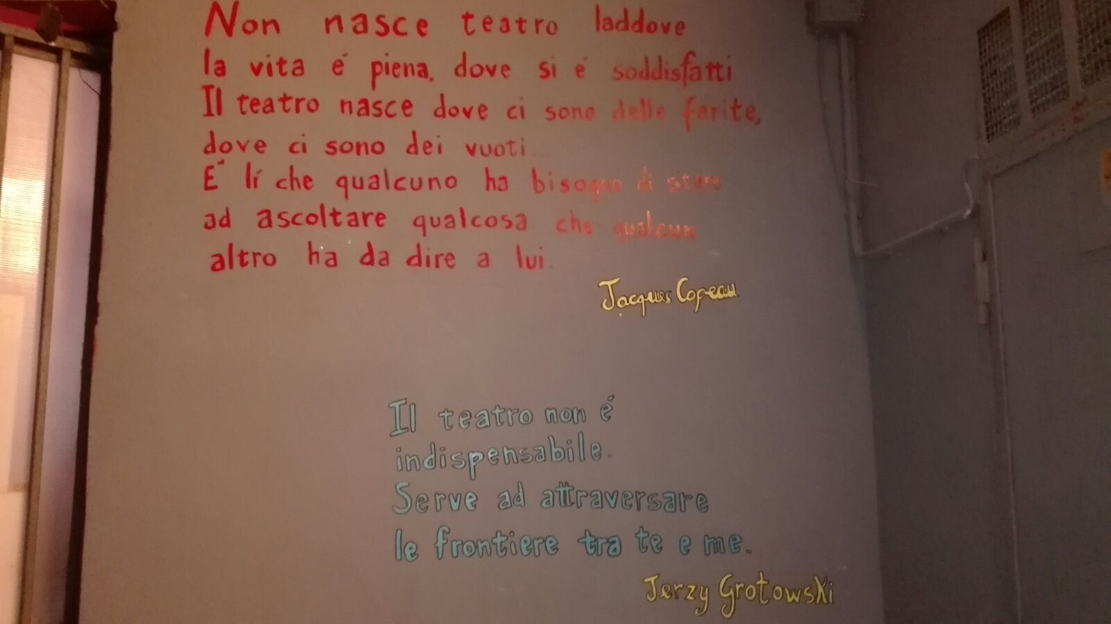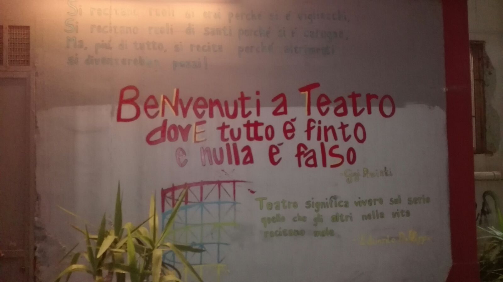L’ingresso al Nest ha un non so che di inquietante. L’accesso alla scuola dove si trova il teatro è a ridosso di una piazzetta solitaria. Poi, tramite un vialetto stretto e buio, si entra in un grande spiazzo adibito a parcheggio. Però, una volta giunti all’interno dell’istituto, si intravedono i colori dei murales dedicati al mondo del teatro. A quest’ultimo si rende omaggio attraverso alcuni aforismi di alcuni tra gli autori più importanti. Infine, basta spingere un portone di metallo per trovarsi finalmente immersi in una luminosa semplicità: l’accoglienza all’ingresso, un bancone di un bar e poi, all’improvviso, vedi passare vicino a te Di Leva, poi Gallo ed infine anche Martone! Insomma, un’intimità che forse il teatro non sempre riesce a trasmettere e che invece al Nest si respira continuamente. Del resto la sala del teatro, circa un centinaio di posti, è al completo ed è caratterizzata da un clima ed un ambiente ristretti e familiari. Ma anche se si ha l’impressione di assistere ad uno spettacolo, come se si fosse nel salotto di casa propria, la rappresentazione è di una professionalità unica ed esemplare.