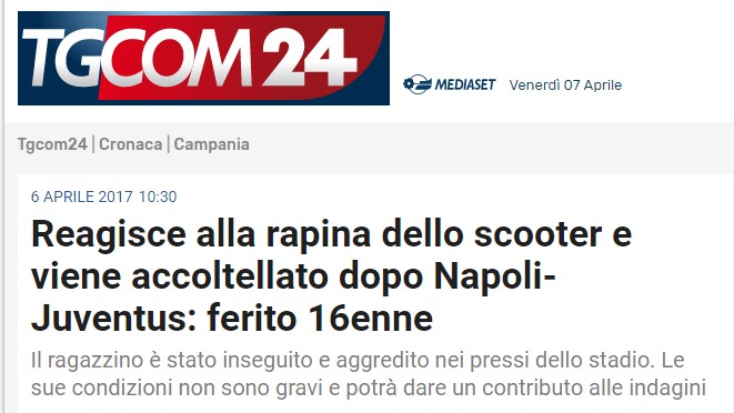 La vicenda è di una violenza incredibile, ma per nulla collegabile all’evento calcistico essendo avvenuto in un luogo distante circa 5 chilometri dallo stadio San Paolo. Seppur si volesse cercare una giustificazione in qualche modo legata al calcio neppure sarebbe possibile perché, secondo quanto è emerso da fonti investigative, si è trattata di una storia di vendetta dapprima diffusa dai media come tentativo di rapina e poi accertata secondariamente come episodio di aggressione ai danni del ragazzino.