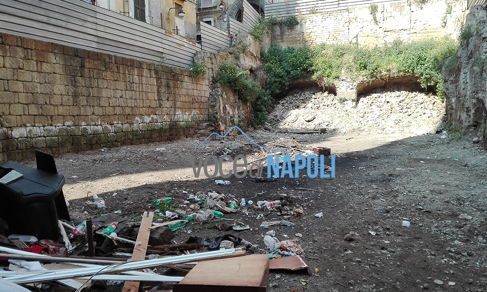 Il terremoto del 23 dicembre del 1980 ha danneggiato un palazzo dei Quartieri Spagnoli definitivamente crollato nel 1994. Nel 2009 è stato approvato un progetto di ricostruzione e ad oggi, aprile 2017, non è ancora cambiato nulla. Sulle macerie dell’edificio che si trova tra vico lungo Montecalvario, vico Canale e vicoletto della Tofa, regnano ancora sporcizia e degrado. Uno spazio abbandonato e autogestito dai residenti che è diventato negli anni una vera e propria discarica a cielo aperto. Nel cuore del centro di Napoli quest’area rappresenta anche un pericolo per gli scugnizzi che si divertono a scavalcare, entrare ed uscire da questo luogo, rischiando spesso per la propria incolumità.