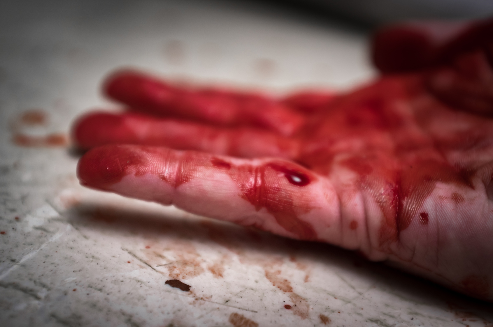 Crime scene murder victim hands with blood spatter on floor