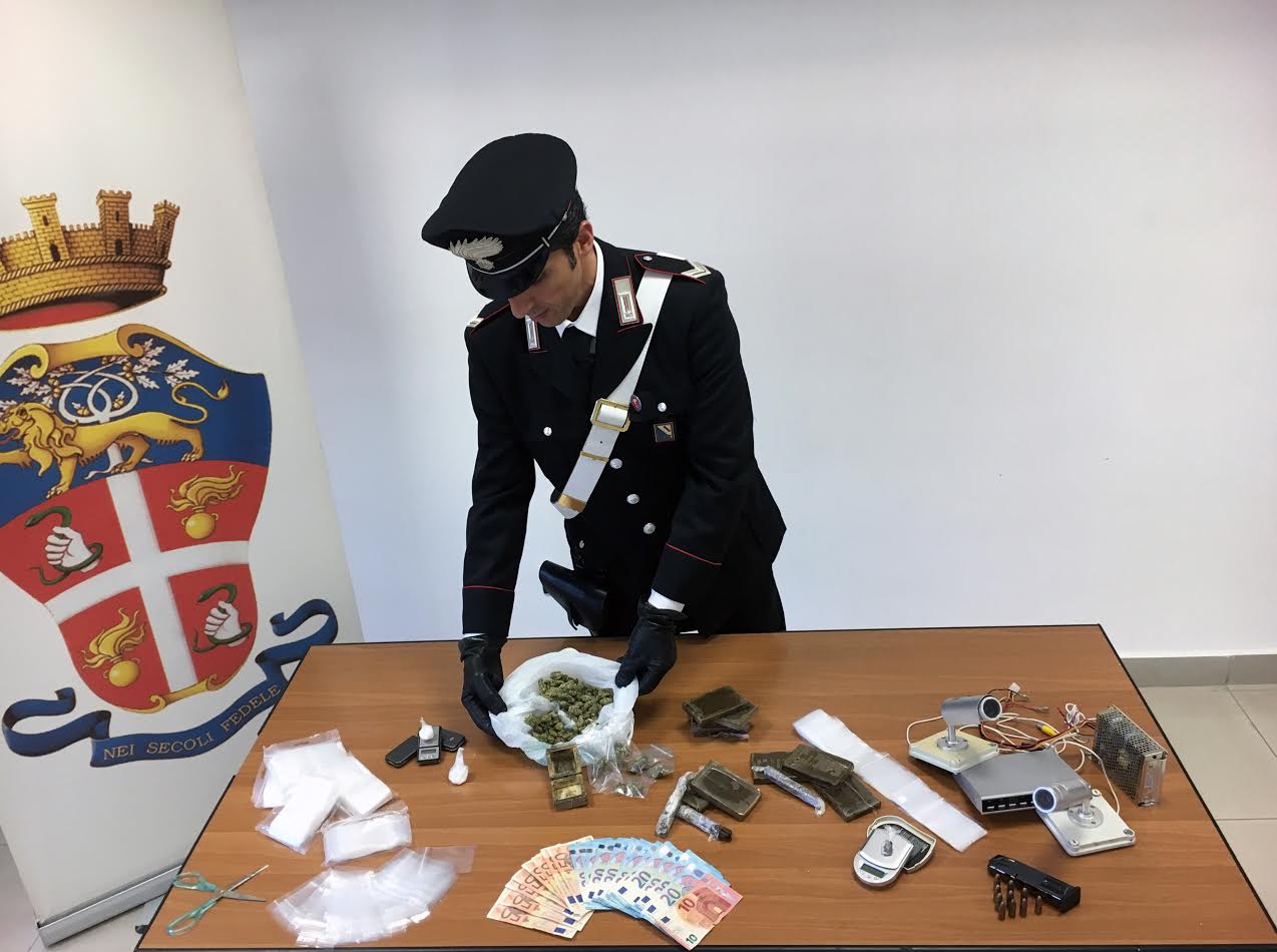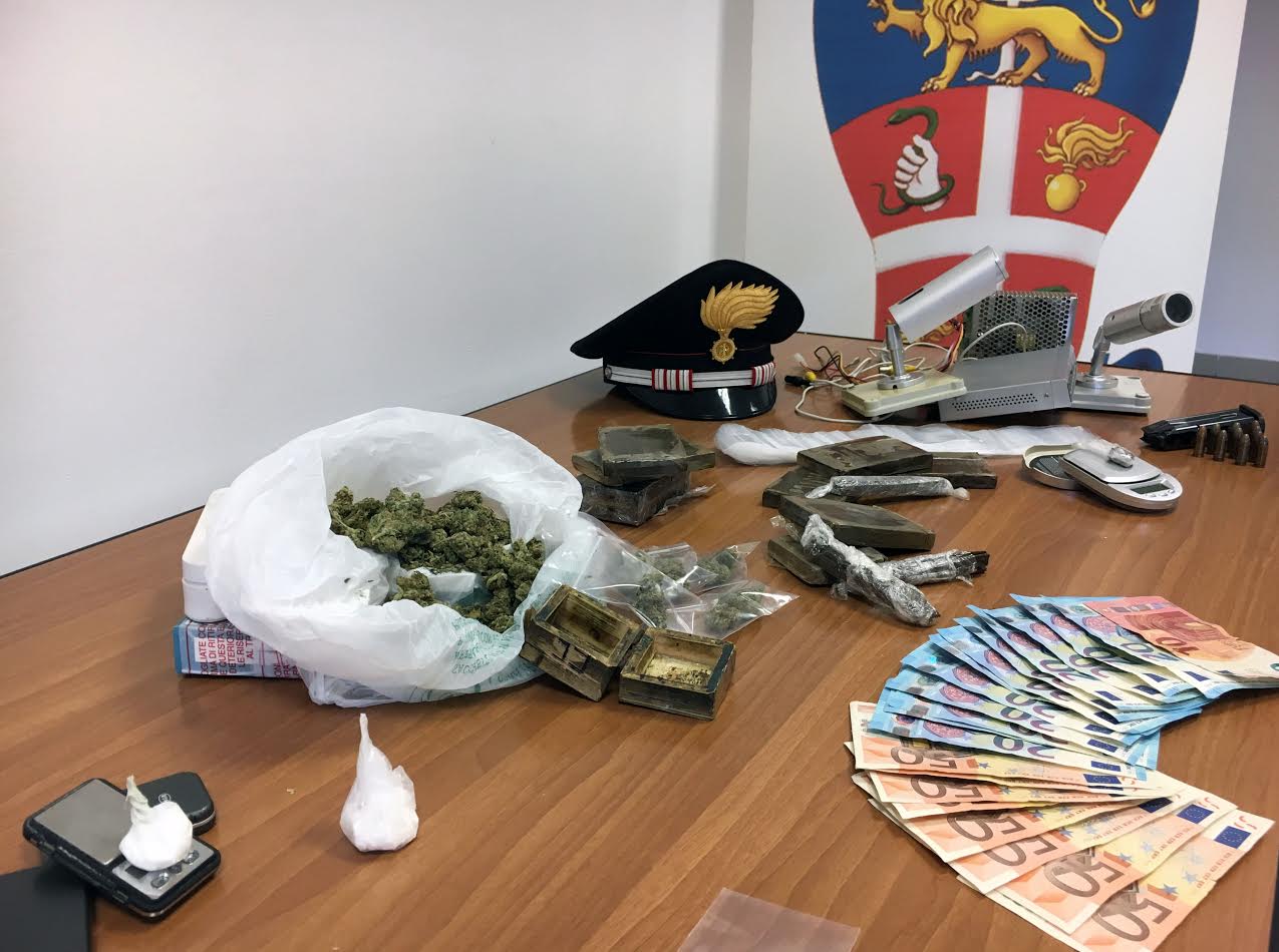 La vedetta, un 44enne di via Caravaggio, incensurato, è stato invece deferito per favoreggiamento dopo essere stato sorpreso a gridare a gran voce il nome convenzionale “mario” all’arrivo dei militari. Trovati e sequestrati infine, nascosti in intercapedini di muri, aiuole e passaruota di auto parcheggiate tra le palazzine, un chilo di hashish, 97 dosi di marijuana, 8 grammi di cocaina, due sistemi di video sorveglianza abusivi, un caricatore con 10 cartucce e materiale per il confezionamento della droga.