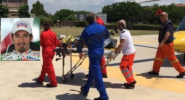 Biaggi, quattro volte campione del mondo nella classe 250 e due volte iridato in Superbike, è stato trasportato con l’elicottero Pegaso 44 all’ospedale San Camillo di Roma in codice rosso per un trauma toracico e spinale.