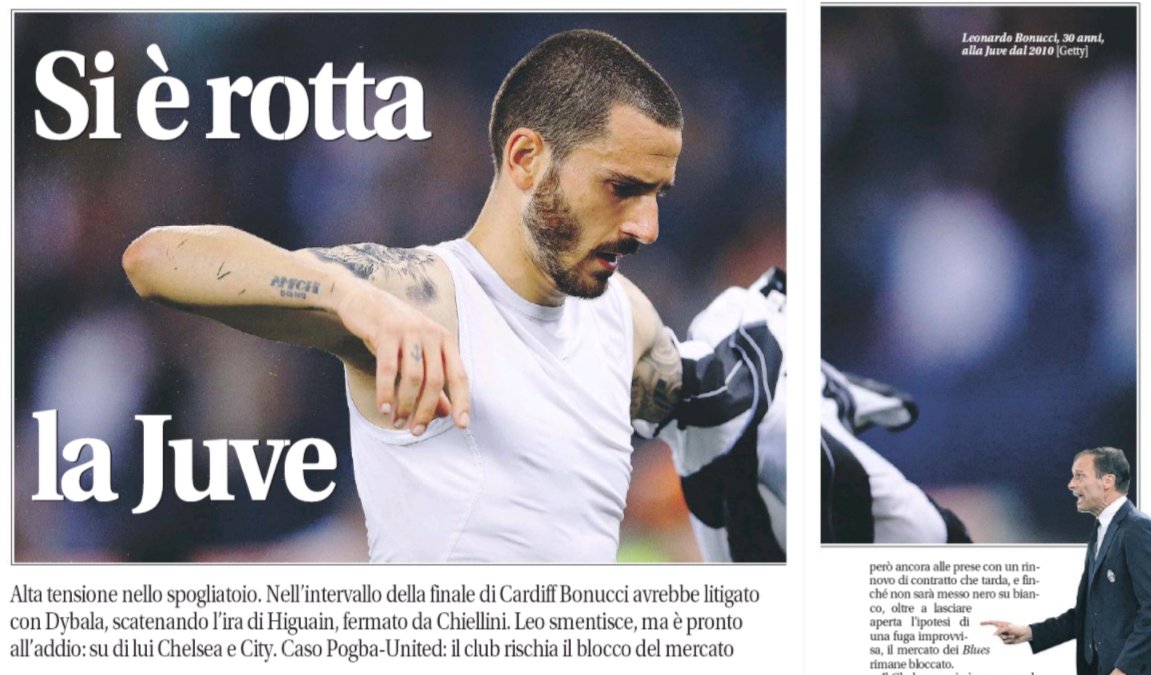 Nonostante la secca smentita di Leonardo Bonucci che ha negato le tensioni avute nell’intervallo di Cardiff con alcuni suoi compagni di squadra, Barzagli e Dybala su tutti (con quest’ultimo che avrebbe ricevuto anche uno scappellotto per il poco impegno in campo), questa mattina la stampa nazionale rincara la dose e rivela nuovi dettagli sulla debacle nella finale di Champions League persa 4-1 con il Real Madrid.