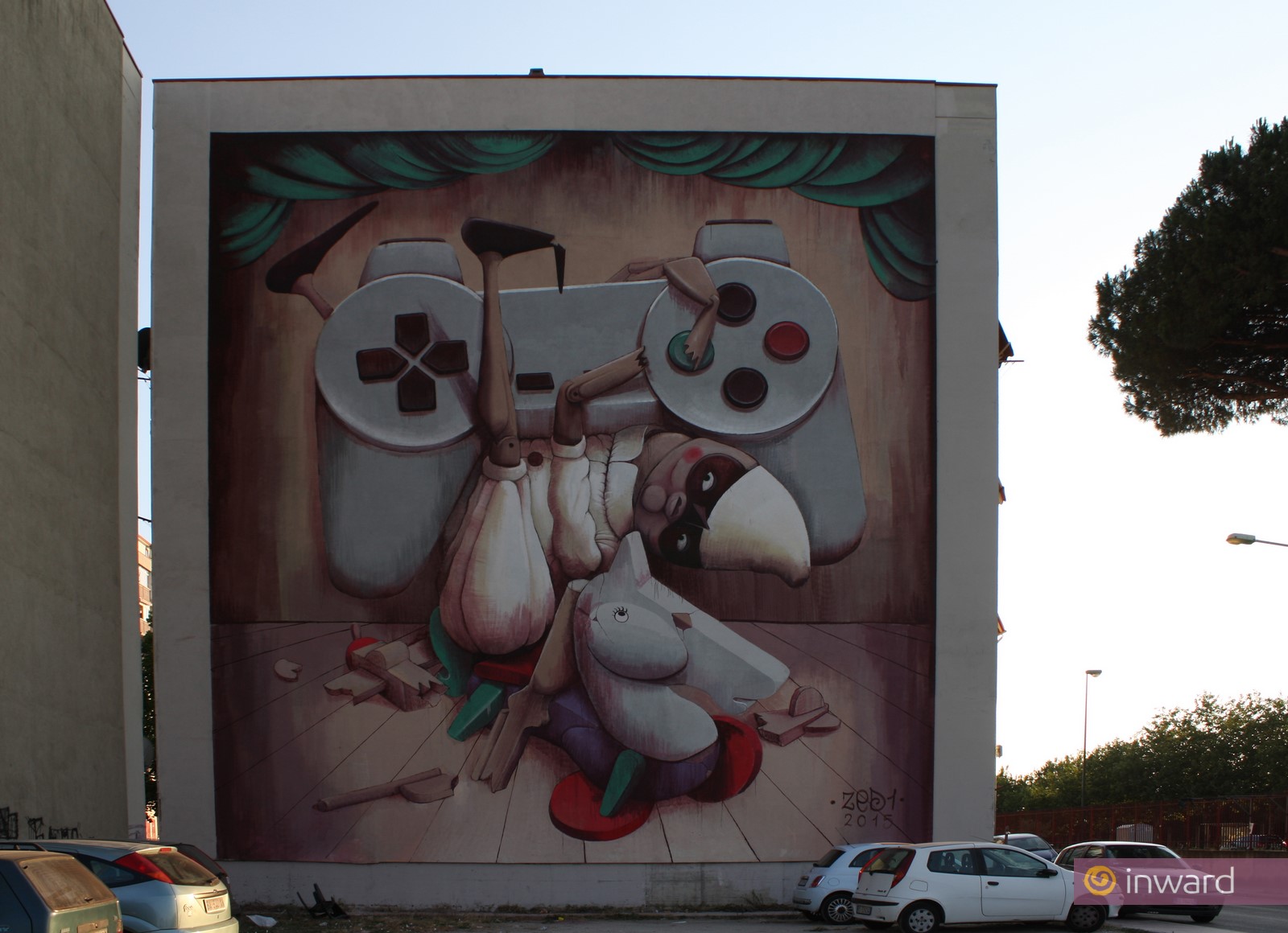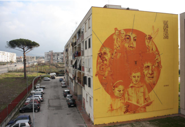 Nella periferia di Napoli, nel quartiere Ponticelli, sorge il Parco Merola, un complesso residenziale degli anni 80 che ospita circa un migliaio dei persone, rinominato ‘Parco dei Murales’. Nella Napoli Est sempre più sola e abbandonata, intrappolata nel degrado e nelle forme criminose, la rete di organizzazioni culturali e sociali ha adottato la zona per un progetto di riqualificazione, un progetto sociale per la rigenerazione a cura di INWARD Osservatorio sulla Creatività Urbana e dall’associazione culturale Arteteca. Il programma pensato per quegli scenari complessi, dove anche la vita quotidiana è difficile, vuole creare il bello per sconfiggere il male che in ogni momento si annida nel territorio. Lo fa in questo caso attraverso delle opere bellissime, realizzate a partire dal 2015, realizzate sugli edifici.