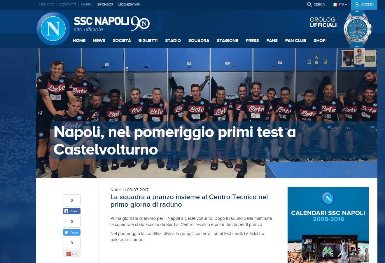 Il Napoli è pronto a partire per Dimaro, raggiungerà il Trentino mercoledì prossimo e nella giornata di oggi la squadra si è già riunita a Castelvolturno per sottoporsi a test medici e fisici. Intanto incuriosisce quanto accaduto sul sito della società, dove in una foto con tutti i compagni riuniti è tagliato solo Pepe Reina. Come si vede dall’immagine il portiere azzurro non compare sulla home page del sito, per vederlo bisogna aprire la foto intera.