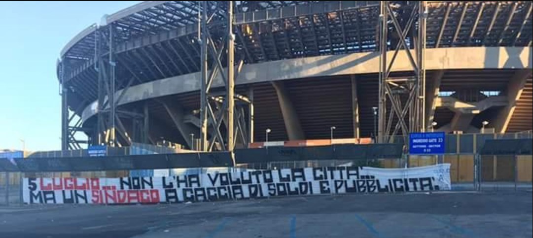 “5 luglio…non l’ha voluto la città…ma un Sindaco a caccia di soldi e pubblicità“, queste le parole scritte sullo striscione apparso in più punti della città. Riconoscibili la galleria Vittoria e lo stadio San Paolo. Si presume che a mettere gli striscioni siano stati dei gruppi di tifosi organizzati che non hanno condiviso la decisione del comune di conferire la cittadinanza a Maradona.