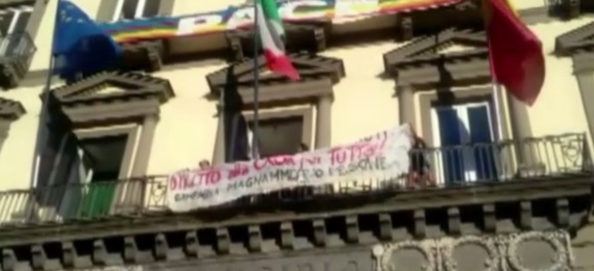 Lì al fianco della bandiera del Comune hanno esposto uno striscione con scritto: “Gli impegni presi vanno mantenuti. Diritto alla casa per tutti. Campagna Magnammece o’ pesone“. Sul posto è giunta un’ambulanza, che ha soccorso il vigile urbano ferito e la polizia di stato. Intanto i manifestanti affacciati al balcone urlano slogan sul diritto alla casa: “La casa è un diritto, l’affitto una rapina. Mandiamoci Giggino a vivere in cantina. Mai più case senza gente“. Soltanto due giorni fa era stata occupata la sede del consiglio comunale da alcuni comitati, che si battevano sempre per il diritto alla casa.
