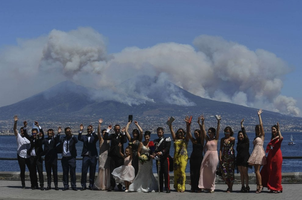 Un’immagine che in queste ore ha creato particolare scalpore sul web, un gruppo intento a festeggiare le nozze, la classica foto di tutti insieme, sorridenti, gli sposi accerchiati da tutti i cari pronti ad immortalare un momento unico. C’è però una nota stonata, alle spalle della coppia circondata da amici e parenti sul lungomare di Napoli, il Vesuvio è sullo sfondo, immerso in una gigantesca nuvola bianca di fumo, quel fumo che sta annientando le popolazioni vesuviane e sta intossicando tutta la Campania.