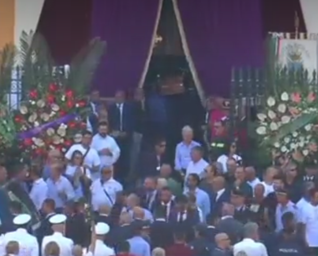 Un grande applauso ha aperto la cerimonia funebre, tantissimi i presenti giunti per porgere l’ultimo saluto. Lacrime, dolore, oltre 10mila i presenti. Uno striscione recita: “Senza di voi ogni giorno sarà più triste. Torre Annunziata vi ama e resiste” sulla zona Porto. All’esterno della chiesa due grandi maxischermi per chi è all’esterno dell’edificio.