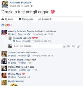 Nel frattempo sulla bacheca del ragazzo tantissimi i messaggi di cordoglio degli amici di Pasquale: “Non ci posso credere Paco, ciao leone!”, scrive Luigi. “Non ti dimenticheremo mai“, scrive Anna, tutti messaggi tristi pubblicati sotto a quel “Grazie per gli auguri” scritto solo qualche giorno fa. Dopo la morte del ragazzo è lutto a Marano, paese d’origine della vittima.