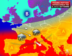 Tra il 3 e il 5 settembre arriverà sul nostro versante una prima fase di aria atlantica, dunque più umida con possibili rovesci temporaleschi anche nell’area settentrionale, seppur in modo irregolare. A partire dal giorno 5 settembre fronti instabili attraverseranno tutta l’Italia con possibilità di piogge e temporali locali.