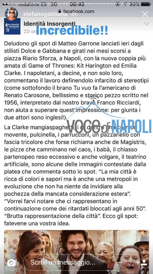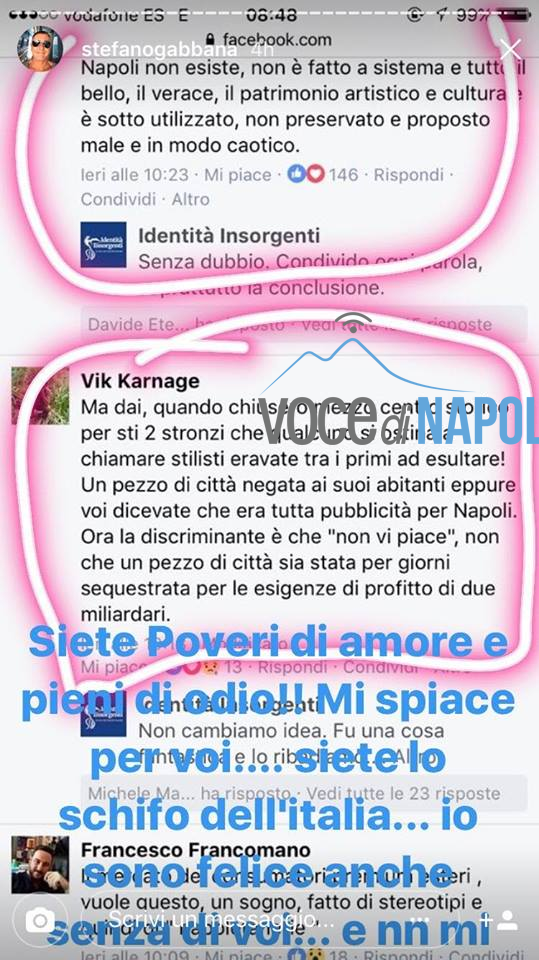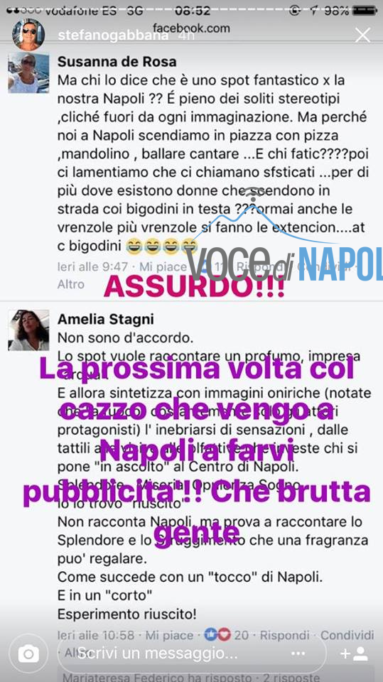 In merito alle critiche che lo spot ha suscitato, sulla pagina “Identità Insorgenti” è stato chiesto alle persone cosa ne pensassero e moltissimi commenti sono stati negativi. Lo stilista Stefano Gabbana non ha presa per niente bene le critiche dei partenopei alla pubblicità girata in città. Dopo aver letto i commenti infatti l’uomo ha pubblicato delle storie sul proprio profilo Instagram evidenziando quelli negativi e offendendo i napoletani con frasi del tipo: “La prossima volta col ca**o che vengo a Napoli a farvi pubblicità! Brutta gente”, “Siete lo schifo d’Italia”.