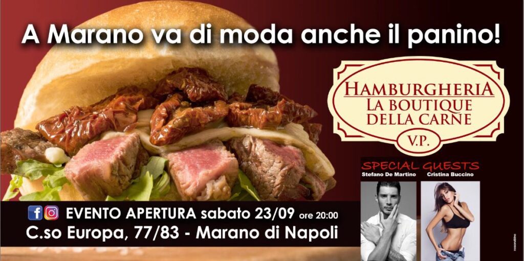 Hamburgeria la boutique della carne inaugurerà sabato 23 settembre alle 20 e gli ospiti verranno intrattenuti con birre artigianali, calici di vino e due ospiti d’eccezione: Stefano De Martino e Cristina Buccino.