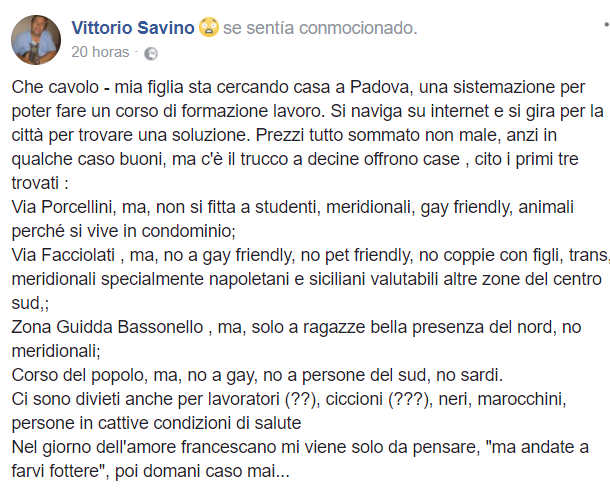 Indignazione sul web per il racconto di un medico della Asl di Caserta, Vittorio Savino, che ha denunciato su Facebook cosa è accaduto a sua figlia mentre cercava casa a Padova, dove dovrà vivere per un periodo.