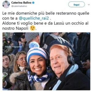 La conduttrice napoletana Caterina Balivo, dopo la scomparsa del famoso giornalista Aldo Biscardi, ha scelto di ricordarlo con un messaggio sul suo profilo ufficiale Instagram. Una foto insieme, sorridenti, sugli spalti dello stadio e la dedica: “Le mie domeniche più belle resteranno quelle con te. Aldone ti voglio bene e da Lassù un occhio al nostro Napoli”.