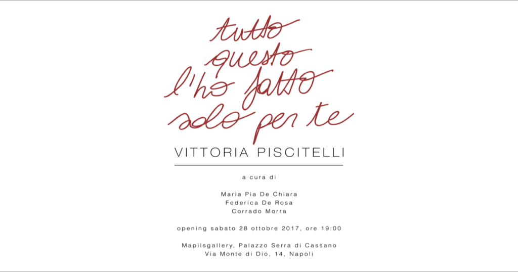 La Mipilsgallery di Maria Pia De Chiara ospita la mostra di Vittoria Piscitelli ‘Tutto questo l’ho fatto solo per te’. L’artista classe 1989 recentemente ha cercato nella parola scritta elementi di comunicazione effettiva al fine di recuperare l’essenza dell’essere umano.