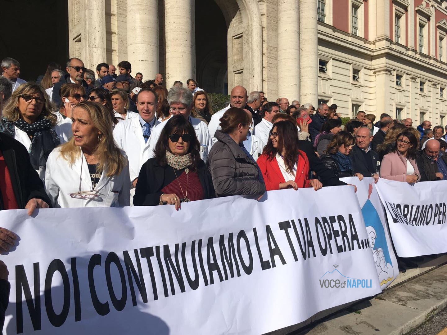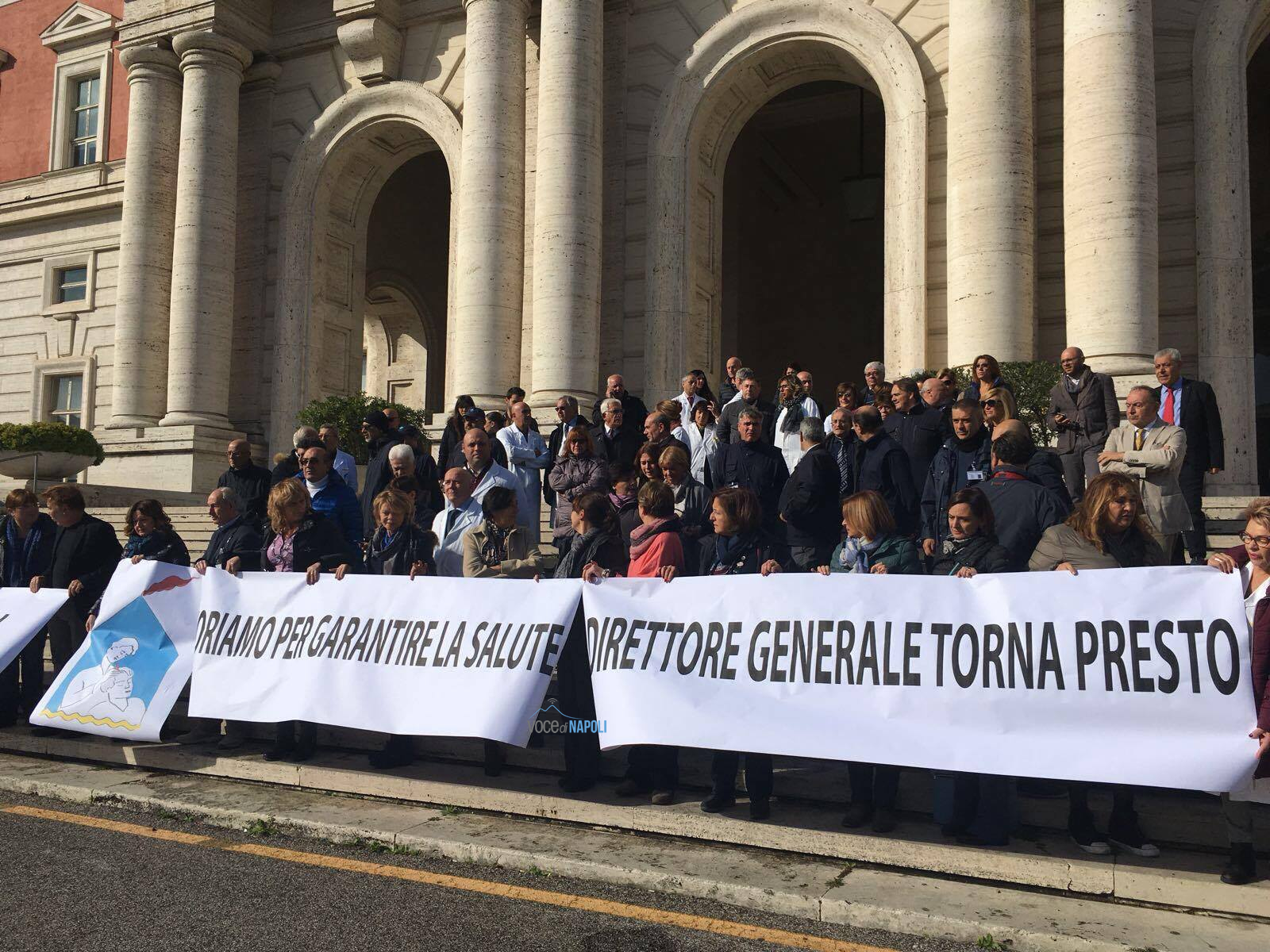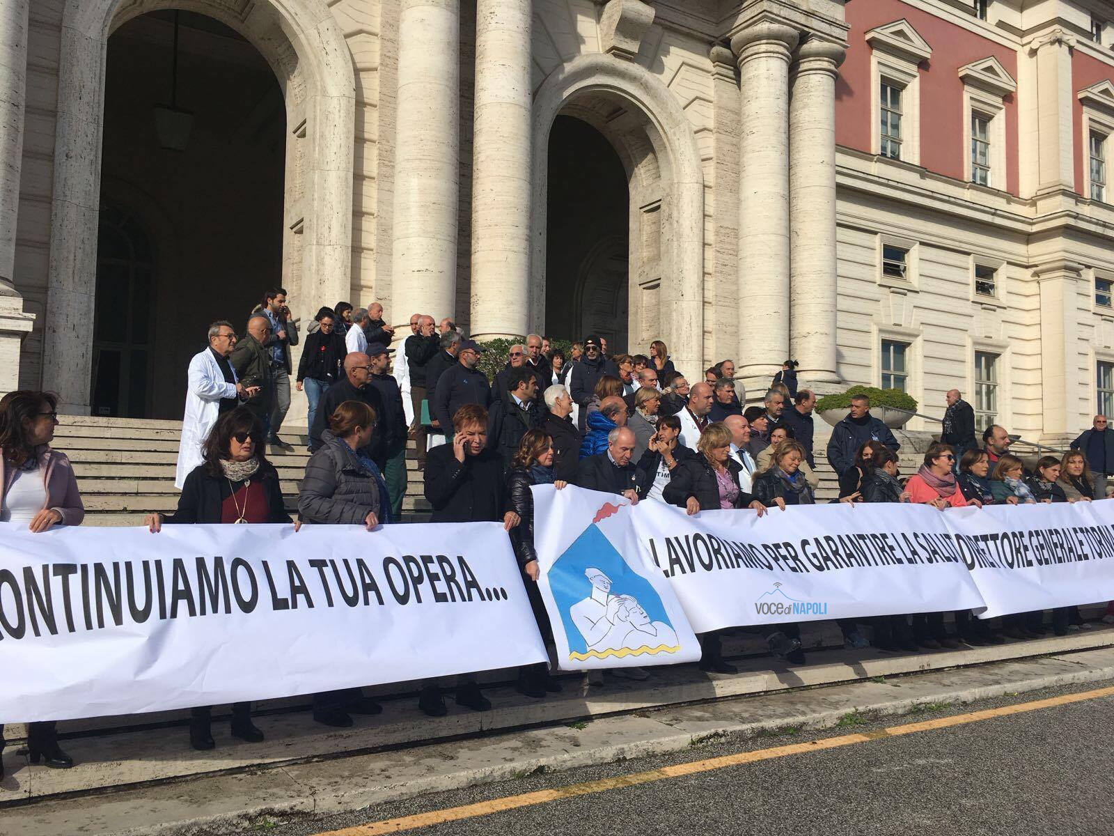 L’altro ieri la tempesta che ha travolto l’ospedale Cardarelli e il suo manager Ciro Verdoliva, oggi il sostegno dei colleghi dopo che allo sfortunato protagonista di questo nuovo filone d’inchiesta, sono stati notificati gli arresti domiciliari. “Noi continuiamo la tua opera. Lavoriamo per garantire la salute. Direttore generale torna presto“, questa la frase scritta sul grande striscione dietro il quale hanno manifestato più di 100 persone.