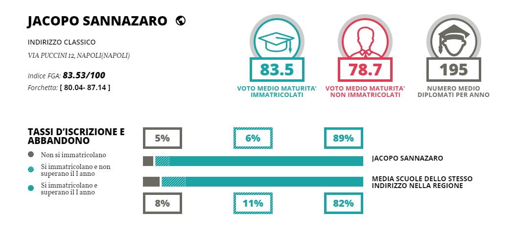 Per l’edizione 2017/2018 risulta essere il liceo classico Sannazzaro il migliore di Napoli. L’indirizzo vomerese supera l’Umberto e il Mercalli. Come sottolinea Andrea Gavosto, direttore della Fondazione Agnelli, “eduscopio.it è diventato in questi quattro anni un riferimento per le famiglie, come dimostrano i circa 800mila utenti unici che hanno a oggi visitato il portale, con un incremento medio annuo del 17%, e i 3,5 milioni di pagine consultate. eduscopio.it è utile perché consente di comparare la qualità delle scuole dell’indirizzo di studio che interessa allo studente nell’area dove risiede. Ha successo perché le informazioni che contiene sono frutto di analisi accurate a partire da grandi banche dati, perciò oggettive e affidabili: aiuta chi non si accontenta del “passa parola” e, in modo particolare, quelle famiglie che non possono contare su reti sociali e culturali forti. In questo senso, è anche uno strumento democratico”.