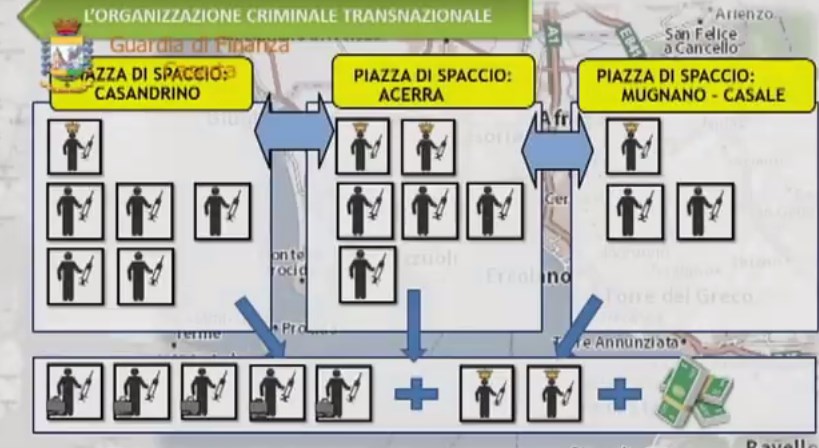 I SEQUESTRI – Acquisito così un completo e ampio quadro probatorio atto a ricostruire nel dettaglio l’intera filiera criminale del traffico e della distribuzione dello stupefacente, rilevata la pericolosita’ dei soggetti indagati e la loro assiduita’ nell’attivita’ delinquenziale, il G.I.P. del Tribunale di Napoli ha disposto l’arresto nei confronti di n. 26 soggetti (19 italiani e 7 albanesi). In concomitanza con l’esecuzione delle misure cautelari personali, i pm antimafia hanno anche disposto d’urgenza il sequestro, finalizzato alla successiva confisca, di tutti i beni nella disponibilita’ degli indagati, il cui possesso non a’ risultato giustificato rispetto ai minimi redditi leciti dagli stessi dichiarati. In esecuzione di tale provvedimento cautelare patrimoniale le Fiamme Gialle hanno bloccato le disponibilita’ liquide riconducibili a ben 65 rapporti finanziari, un appartamento e una cantina siti in Casandrino, 2 ditte di autotrasporto site in Napoli e in Mugnano, 1 internet point di Acerra, 2 panifici siti a Casandrino e a Grumo Nevano e una Fiat 500 XL intestata ad un prestanome, per un valore complessivo allo stato quantificabile in oltre mezzo milione di euro.
