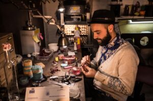La bottega d’artigianato ‘Eres Design’ compie due anni e festeggia sabato 2 dicembre alle ore 19 questo importante traguardo con un party ad ingresso gratuito in cui sarà presentata la nuova collezione ‘Stalattiti’. Il giovane artigiano Flavio Toro nel locale sito in via Arenella 94 al Vomero ha saputo creare vere opere d’arte, lavorando a mano ogni singolo gioiello in tutte le sue fasi.
