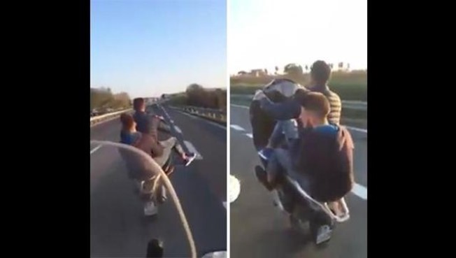Quattro ragazzi su due motorini scorrazzano sul tratto di tangenziale tra Lago Patria e Pozzuoli in direzione Napoli, impennando i loro scooter con maestria fieri della loro esibizione. Un comportamento deplorevole, sono senza casco e non rispettano la benché minima norma del codice stradale.