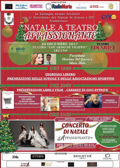 Un evento da non perdere e da condividere con tutta la famiglia: mercoledì 20 dicembre 2017 la rassegna Arzano Solidale, con il patrocinio del Comune di Arzano e CSV, presenta al Teatro Eduardo de Filippo della cittadina della provincia di Napoli “Natale a Teatro Appassionante“. Il cartellone della giornata, di cui VocediNapoli.it è media partner, prevede un primo evento alle 18 con la premiazione delle scuole e delle associazioni sportive e per cui l’ingresso è libero. A seguire, alle 20, verrà presentato il libro del giornalista Silver Mele, Il volo del gregario cui seguirà la presentazione del film del regista Fabio Massa, Effetto domino. Gigi Attrice con il suo esilarante cabaret intratterrà i presenti al Teatro Eduardo de Filippo, mentre la serata si concluderà con il concerto delle Appassionante, gruppo musicale nato nel 2002 e formato da tre soprano: Giorgia Villa, Stefania Francabandiera e Mara Tanchis. La serata, presentata da Christina Del Grosso e da Silver Mele, sarà trasmessa in diretta da Radio Marte. Il costo del biglietto è di 16 euro, i posti sono numerati.