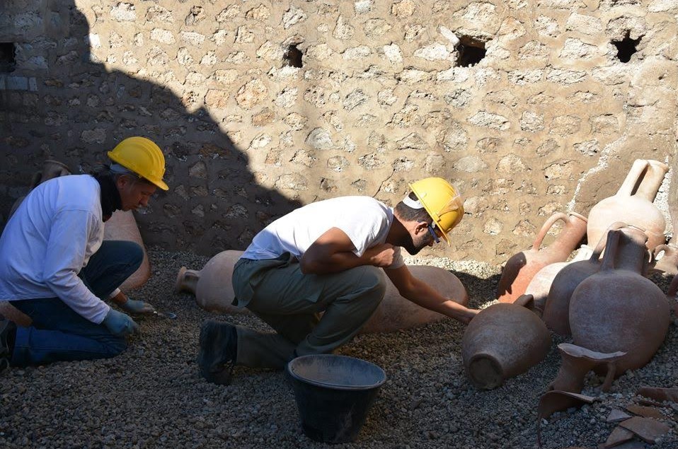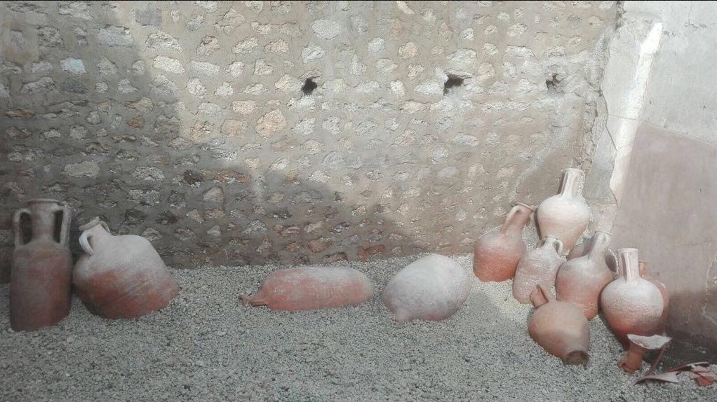 Queste sono state rinvenute in perfette condizioni, contenevano olio, vino, salse di pesce. Su una è leggile una iscrizione, si tratterebbe di numeri e probabilmente il nome del prodotto contenutovi. Le anfore, al termine dello scavo, saranno ricollocate nell’ambito del progetto di valorizzazione del ‘museo diffuso’ che il Parco Archeologico sta adottando in diverse aree degli scavi per ricontestualizzare i reperti.
