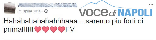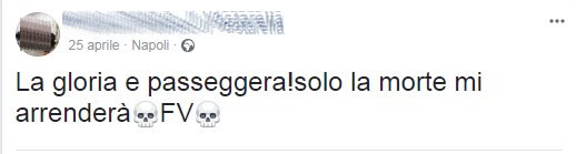 A colpire principalmente è un messaggio affidato a Facebook tre giorni dopo la strage. Un messaggio di sfida agli odiati rivali. Una lunga risata nonostante la morte di due suoi familiari prima del “saremo più forti di prima” con tanto si sigla finale “FV” (famiglia Vastarella). Poi un altro post poche ore dopo (“La gloria e passeggere! solo la morte mi arrenderà” con la sigla di famiglia alla fine) prima dell’attacco ai pentiti nelle settimane successive.