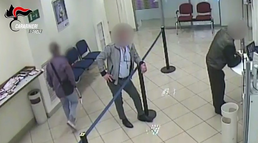 IL FILO DI BANCA – Alcuni video dell’impianto di sorveglianza lo riprendono mentre finge di attendere il turno all’interno di una banca di Casavatore mentre in realtà sta osservando le operazioni di prelievo dei clienti per individuare quelli che avevano preso più contante e segnalarli ai complici. Gli altri 2, su uno scooter, avevano poco dopo raggiunto la vittima costringendola a consegnare con la minaccia di una pistola i 1900 euro appena prelevati.