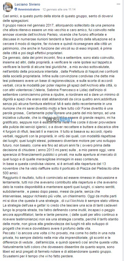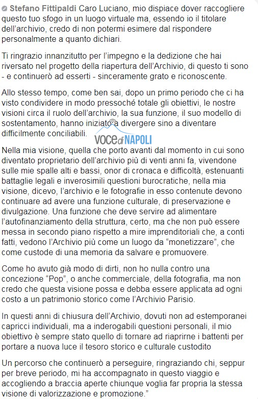 Che poi ha affermato, all’interno di un secondo post: “Cari amici, a questo punto della storia di questo gruppo, sento di dovervi delle spiegazioni. Il gruppo nasce nel gennaio 2017, allorquando sollecitato da una persona che allora ritenevo essere un mio vecchio e caro amico, fui coinvolto nelle annose vicende dell’Archivio Parisio, vicende che furono affrontate e discusse in numerose riunioni tendenti a fare il punto della situazione ed a cercare il modo di riaprire, far rivivere e quindi riconsegnare alla città un patrimonio, che anche in funzione dei vincoli su di esso imposti, è prima della città e poi degli effettivi proprietari. Da gennaio, data dei primi incontri, fino a settembre, sono stato coinvolto, insieme ad altri, dalla proprietà, a verificare le varie ipotesi sul tappeto;a verificare la bontà di alcune tesi giuridiche , a mio avviso sottovalutate, nell’ambito della procedura intentata , dalla Prefettura di Napoli,nei confronti della società proprietaria. Infine sulla convinzione condivisa che dette mie tesi potessero avere un base di ragionevolezza, e sulla scorta di accordi verbali, circa le modalità per poter riaprire gli spazi dell’Archivio alla città, io con altri volenterosi (Valeria, Sabrina Francesco e Lidia) dall’inizio di settembre cominciammo prima a ripulire, a riordinare ed a dare un minimo di dignità a spazi che erano stati abbandonati da circa quattro anni,addirittura senza più alcuna fornitura elettrica! Mi è stato detto recentemente in una riunione che mi sarei divertito molto a fare tutto ciò! Forse divertito è una parola grossa,. Certamente poter donare una parte del mio tempo, ad una iniziativa culturale, che io ritengo potrebbe essere di grande respiro, mi ha gratificato, seppure non è esattamente nelle mie corde il dover provvedere alla pulizia dei servizi igienici, o a dover raccattare e buttare a discarica oltre 4 furgoni di rifiuti, lasciati lì a marcire. Il tutto si basava su accordi, ripeto verbali, raggiunti con la proprietà, in virtù dei quali, con modalità rispettose dei luoghi, quei luoghi stessi, potessero diventare motore per uno sviluppo futuro, non basato, come era fino ad alcuni anni fa ( ovvero prima della decisione di chiudere ( anno 2013 mi pare) sulla , a mio parere oggi, vana speranza di finanziamenti pubblici o privati, ma sulla apertura al mercato di quel luogo e di quelle meravigliose immagini in esso contenute. In base a questa condivisa visione, si è arrivati alla riapertura del 13 novembre che ha visto riaffluire sotto il porticato di Piazza del Plebiscito oltre 500 amici. Raggiunto il risultato, tutto è cominciato ad essere rimesso in discussione e lentamente, tutti noi che avevamo contribuito alla riapertura e che avevamo dato la nostra disponibilità a mantenere aperti quei luoghi, ci siamo sentiti, subdolamente , e passo dopo passo, messi da parte, senza che intervenisse, seppur richiesto più volte, un chiarimento. Oggi da molte parti mi si dice che questa è una strategia , di cui l’Archivio è sempre stato vittima. La strategia dell’usa e getta! Io credo che lasciare una scia di tanti cadaveri lungo la propria strada, tra l’altro definendo come inutili, incapaci o peggio ancora approfittatori, tante e tante persone, ( dalle quali per altro continuo a ricevere testimonianze) non sia una strategia corretta, perchè il tanfo stantio della morte, non giova alla gradevolezza dei luoghi nè allo sviluppo di progetti che invece dovrebbero avere il profumo della vita. Peccato! io ancora una volta ci ho provato, ma come ho detto in una nota privata, ho sempre distinto nella mia vita imprenditoriale, gli scontri e le differenze di vedute, dall’amicizia, e quindi opererò così anche questa volta. Naturalmente tutti coloro che dovessero dissentire da quanto sopra, sono liberi ed anzi pregati di farmelo notare e di abbandonare questo gruppo. Scusatemi per il tempo che vi ho fatto perdere“.