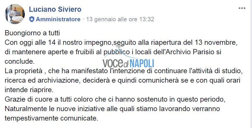 “Buongiorno a tutti. Con oggi alle 14 il nostro impegno,seguito alla riapertura del 13 novembre, di mantenere aperte e fruibili al pubblico i locali dell’Archivio Parisio si conclude. La proprietà , che ha manifestato l’intenzione di continuare l’attività di studio, ricerca ed archiviazione, deciderà e quindi comunicherà se e con quali orari intende riaprire. Grazie di cuore a tutti coloro che ci hanno sostenuto in questo periodo, Naturalmente le nuove iniziative alle quali stiamo lavorando verranno tempestivamente comunicate“, queste le dichiarazioni di Luciano Siviero.