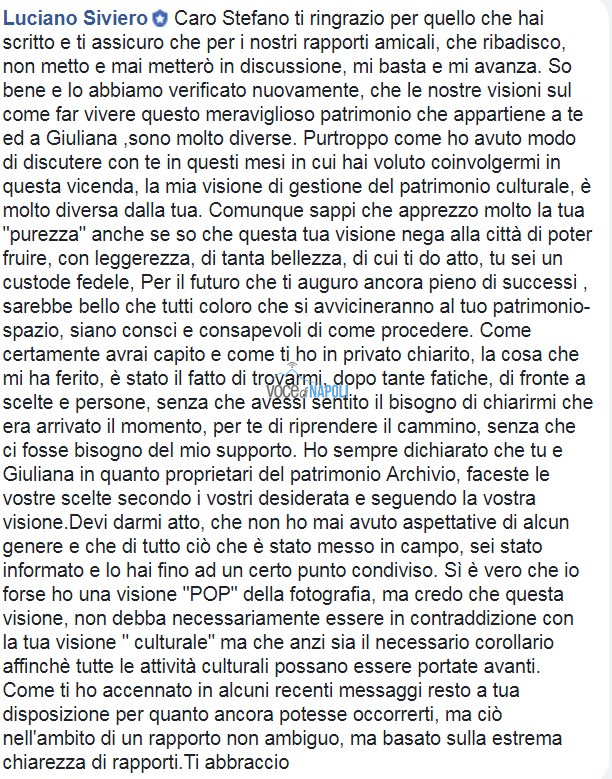 Infine, la risposta conclusiva di Siviero: “Caro Stefano ti ringrazio per quello che hai scritto e ti assicuro che per i nostri rapporti amicali, che ribadisco, non metto e mai metterò in discussione, mi basta e mi avanza. So bene e lo abbiamo verificato nuovamente, che le nostre visioni sul come far vivere questo meraviglioso patrimonio che appartiene a te ed a Giuliana ,sono molto diverse. Purtroppo come ho avuto modo di discutere con te in questi mesi in cui hai voluto coinvolgermi in questa vicenda, la mia visione di gestione del patrimonio culturale, è molto diversa dalla tua. Comunque sappi che apprezzo molto la tua “purezza” anche se so che questa tua visione nega alla città di poter fruire, con leggerezza, di tanta bellezza, di cui ti do atto, tu sei un custode fedele, Per il futuro che ti auguro ancora pieno di successi , sarebbe bello che tutti coloro che si avvicineranno al tuo patrimonio-spazio, siano consci e consapevoli di come procedere. Come certamente avrai capito e come ti ho in privato chiarito, la cosa che mi ha ferito, è stato il fatto di trovarmi, dopo tante fatiche, di fronte a scelte e persone, senza che avessi sentito il bisogno di chiarirmi che era arrivato il momento, per te di riprendere il cammino, senza che ci fosse bisogno del mio supporto. Ho sempre dichiarato che tu e Giuliana in quanto proprietari del patrimonio Archivio, faceste le vostre scelte secondo i vostri desiderata e seguendo la vostra visione.Devi darmi atto, che non ho mai avuto aspettative di alcun genere e che di tutto ciò che è stato messo in campo, sei stato informato e lo hai fino ad un certo punto condiviso. Sì è vero che io forse ho una visione “POP” della fotografia, ma credo che questa visione, non debba necessariamente essere in contraddizione con la tua visione ” culturale” ma che anzi sia il necessario corollario affinchè tutte le attività culturali possano essere portate avanti. Come ti ho accennato in alcuni recenti messaggi resto a tua disposizione per quanto ancora potesse occorrerti, ma ciò nell’ambito di un rapporto non ambiguo, ma basato sulla estrema chiarezza di rapporti.Ti abbraccio“.