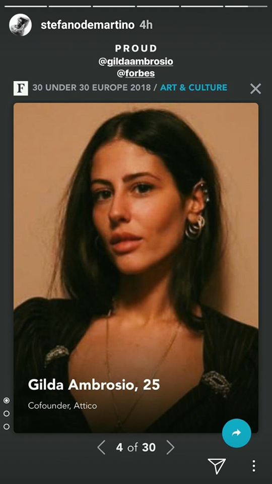 La fondatrice del marchio “The Attico”, diventato in poco tempo famosissimo nel mondo della moda, è stata selezionata dalla rivista Forbes tra i 300 ragazzi sotto i 30 anni che stanno facendo grandi cose in ambito internazionale. La stilista è rientrata nella categoria “Arte e Cultura” e Forbes le ha riconosciuto la sua voglia di superare i limiti e di voler lasciare un’impronta positiva nel mondo. La maison fondata dall’intraprendente Ambrosio con l’amica Giorgia Tordini nel febbraio del 2016 ha aperto store in 23 diversi Paesi del mondo.